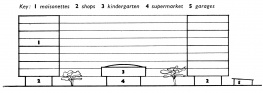 One of the designs contains 1,000 apartments and a whole complex of ancillary buildings: hotels, offices, shops, etc. In this "purdah living" (gender seperation), a complex system of walkways at the second floor, destined for women, links the various blocks together. Seperate lifts serve alternate floors.